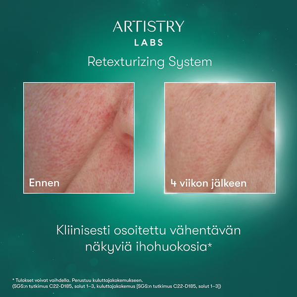 - Artistry Labs Retexturizing System auttaa ihon rakennetta näyttämään jopa 8 vuotta nuoremmalta vain neljässä viikossa, kun tuotteita käytetään yhdessä ohjeiden mukaisesti.